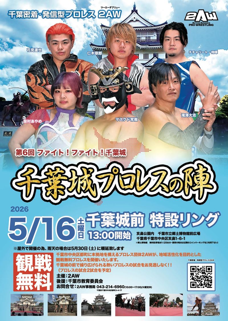千葉密着・発信型プロレス2AWは、5月16日(土)に千葉・千葉城前 特設リングにて『第6回 ファイト!ファイト!千葉城 ~千葉城プロレスの陣~』を開催することを発表した。