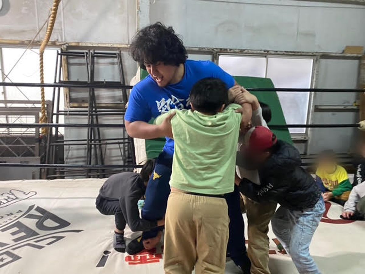 普段は屈強なレスラーたちが激しい稽古に励む道場が、この日は子ども達の明るい笑顔と歓声に包まれた。