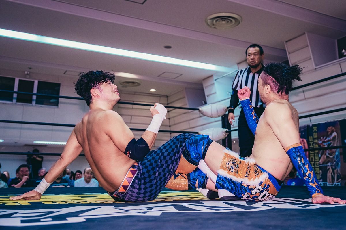 エルボーのラリーから前口がソバット、冨永がJKも2カウント。