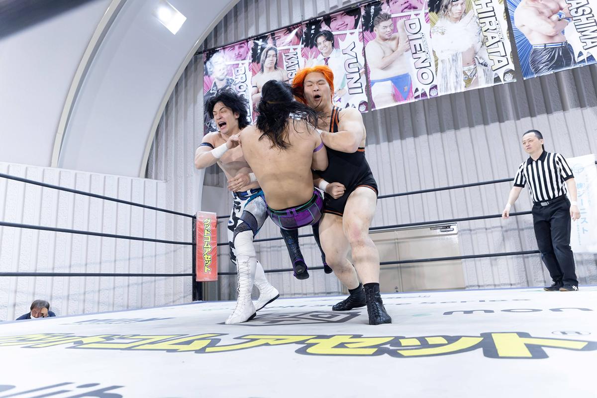 また、かつてKO-Dタッグ王座に君臨した上野勇希&吉村直巳のノーチラスが2020年10・25後楽園以来、5年半ぶりに一夜限定で復活し、正田壮史&高鹿佑也と対戦。吉村が高鹿に払腰、上野がフロッグスプラッシュ。さらに上野がスタンド式シャイニング・ウィザードもカット。高鹿がエルボードロップを狙うも、上野が丸め込んで3カウント。元ノーチラスが勝ちどきを挙げた。