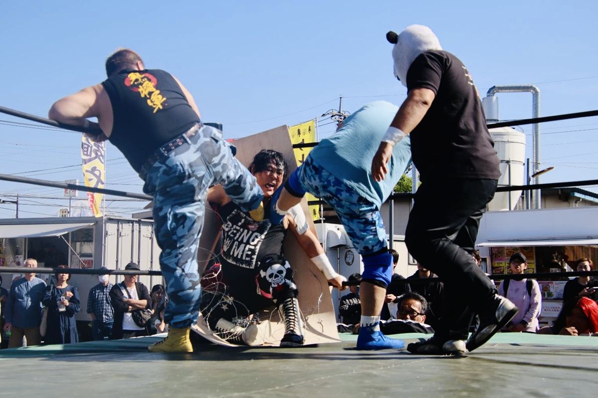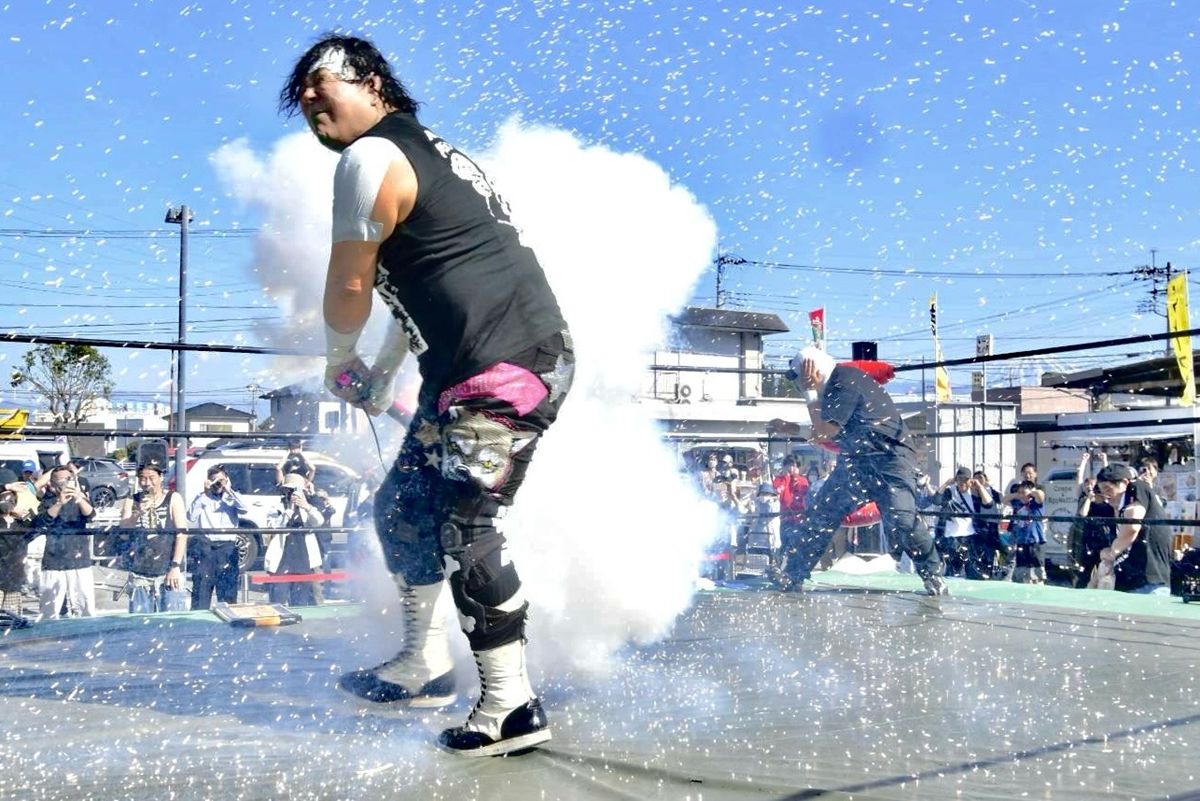 JA山梨みらいの直売所前に設けられたリングで、プロレス3試合とキッズダンスのパフォーマンスが行われ、メインイベントは電流爆破マッチが行われた。