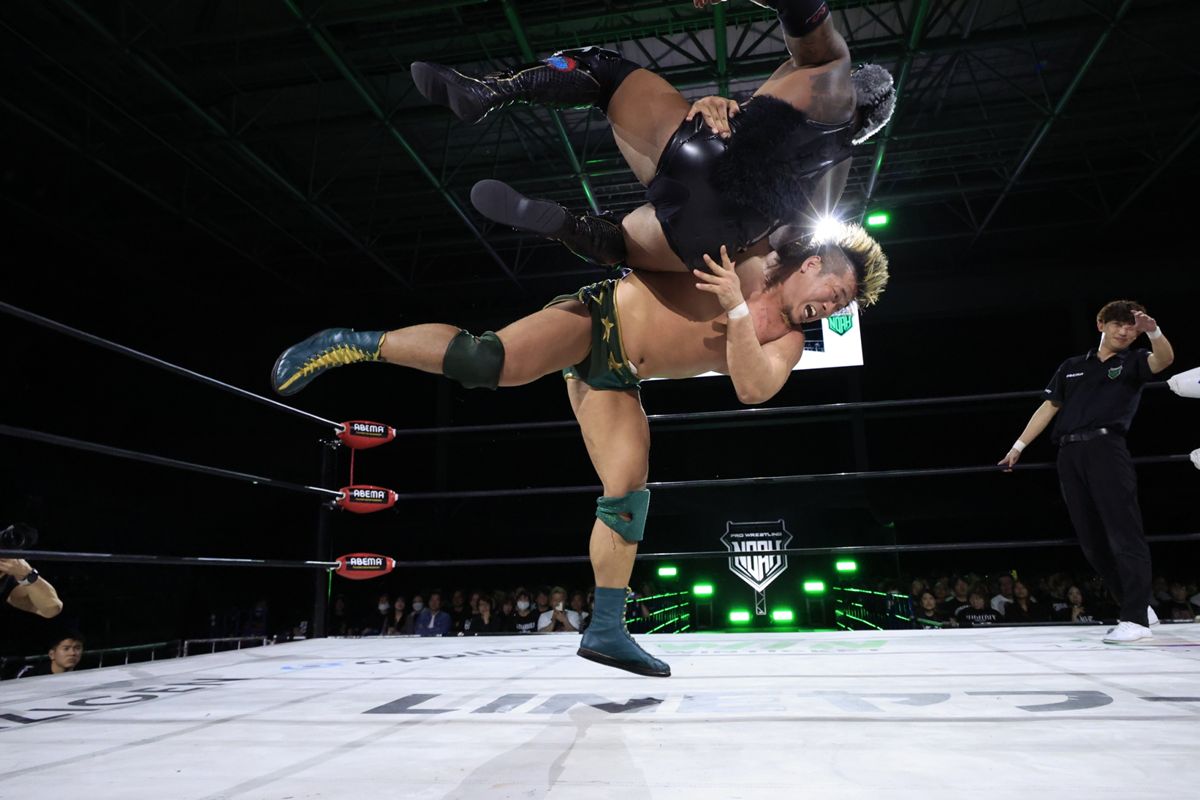 メインイベント(第8試合)で行われた至宝・GHCヘビー級選手権試合では、第49代王者のYoshiki Inamuraと挑戦者アルファ・ウルフが激突。