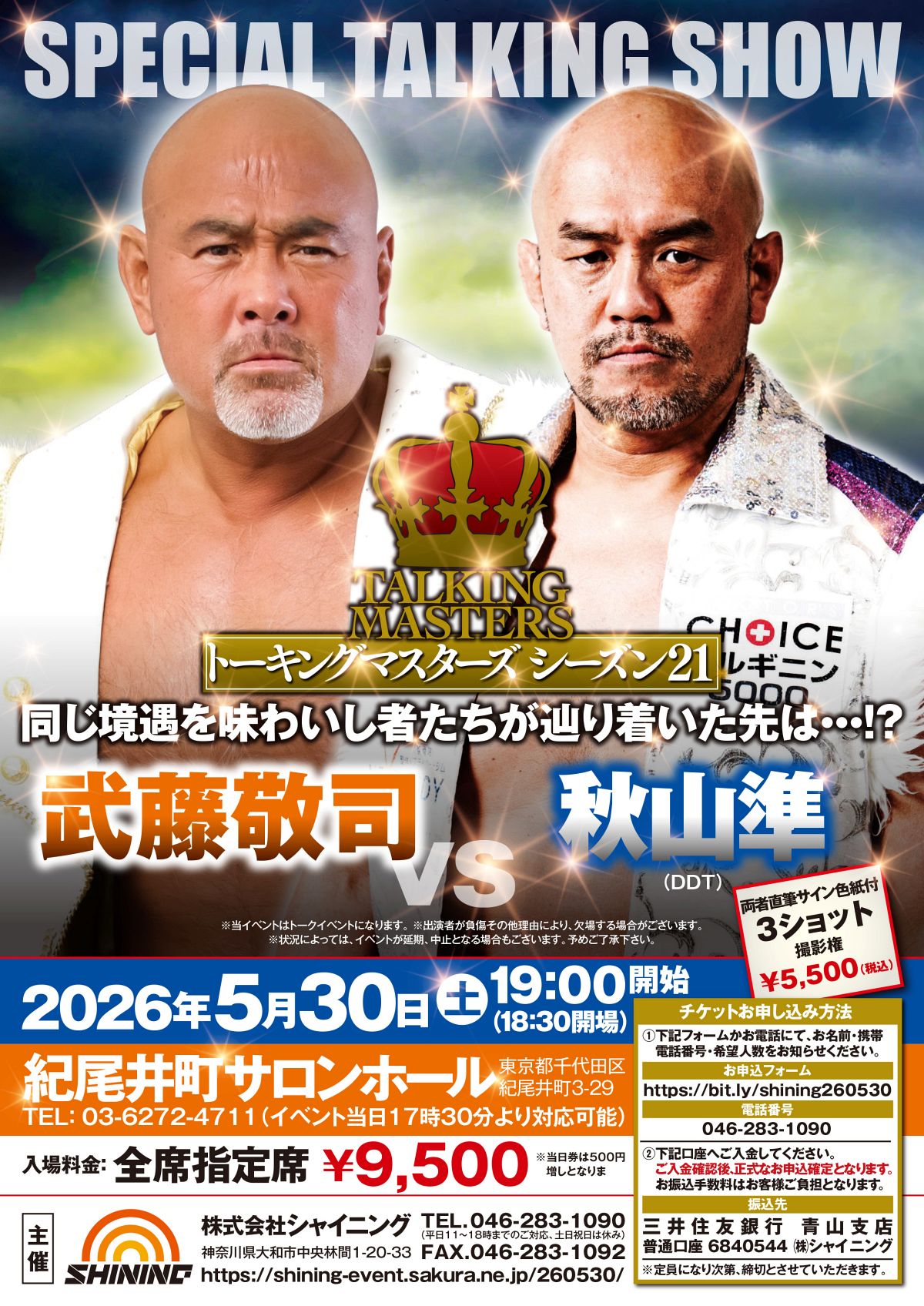 プロレスラーのトークイベントを数多く手掛ける株式会社シャイニングが、2026年5月30日(土)に東京・紀尾井町サロンホールにて『トーキングマスターズ ~同じ境遇を味わいし者たちが辿り着いた先は・・・!?~ 武藤敬司 vs 秋山準』を開催する。