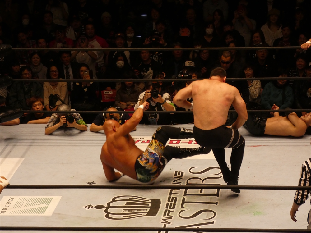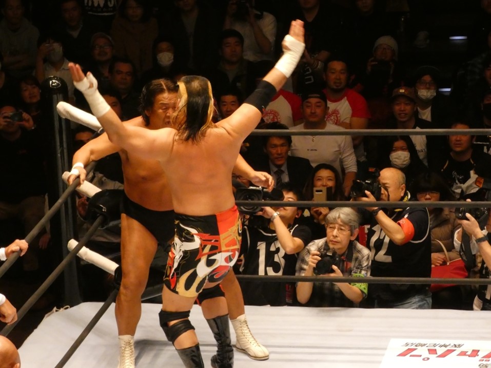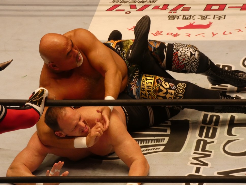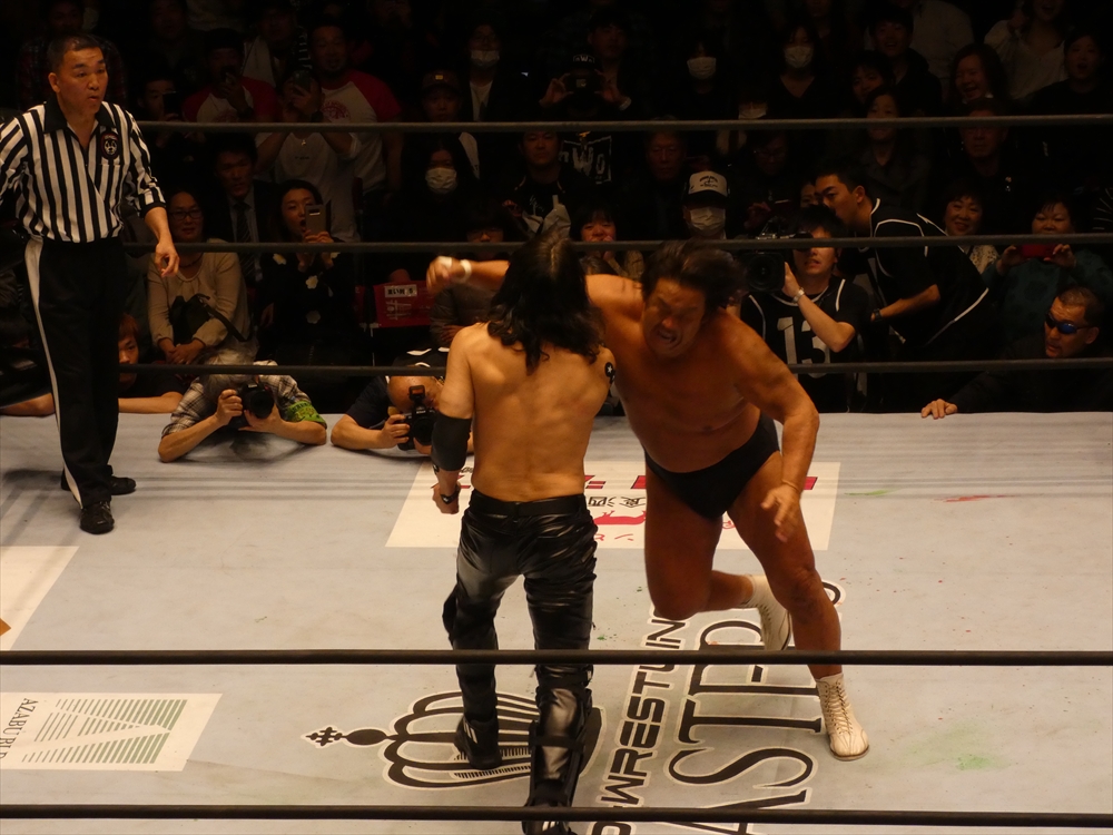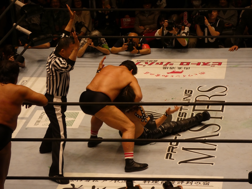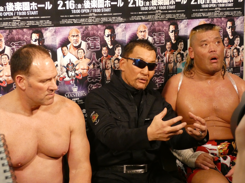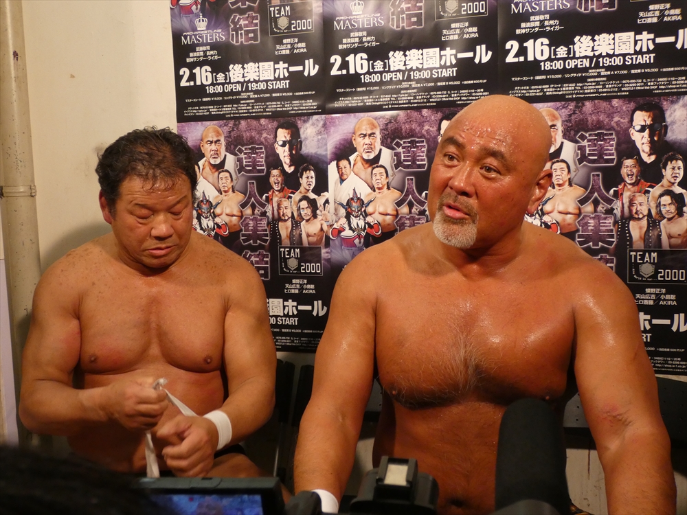 蝶野「俺も、マスターズという大会がいいのか悪いのか、はっきり判断がついてないですね。一生懸命やっている選手だし、キャリア40年以上の選手たちがリングに上がっているということの素晴らしさもあるし。現に若い選手たちが体を張ってやっている団体もあるし。一応ひとつの先頭集団は繋がるのかもしれないけど、同じものではないだろうという考え方もあるでしょう。やっぱりそこは、上がる選手たちが、今日なんかも、相手の選手は、我々の15年前、20年前の部分で、はっきり言って胸くそ悪い連中の集まりですから。リング上でも言いましたけど、美味しいところをとにかく全て持っていくと。たぶん今日向こうはね、試合の中で1つか2つしか美味しいところはなかった。そこをハイエナのように、彼らは群がる。で、今日みたいに8人タッグ戦っていうのは、ここはチームワークです。ここはコントロールするという。そういうところでT2000というのは、新日本の中でいろいろな時代のチームがある中でも、ヒロ(斉藤)さん中心に、チームワークの配分というのは、俺は鉄壁なチームだと思います。今日もみんな昔のコンディションではないと思うけど、その中でも素晴らしい役割を果たしたと。力的には向こうのほうが上だったかもしれない。でも、今日はスーパーJをいきなり呼んで来たところで、ちゃんと役割を決めた中で試合をやるというね。それは俺らの実力だし、それはしっかり見せれたことは良かったなと思います。」