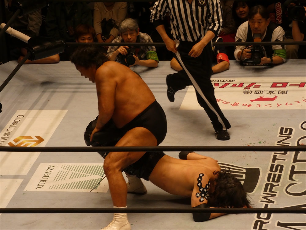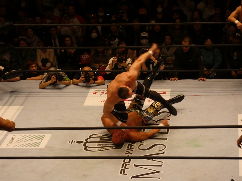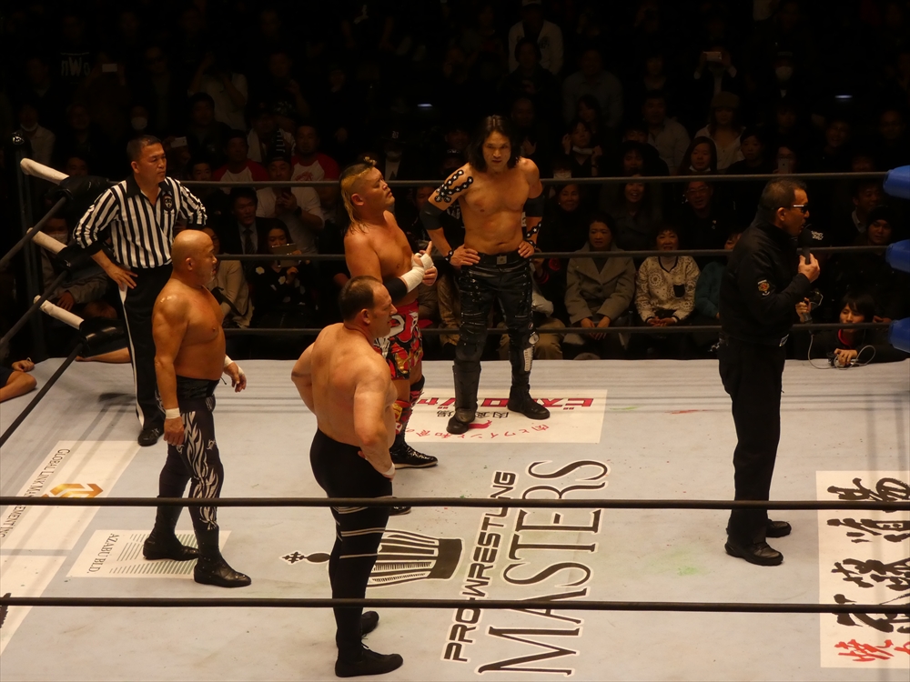 蝶野「おい、武藤、オマエだろこのリング仕切ってんのは!マスターズ、おい、わかるかオラ。お荷物だよ、ここは。オマエもだよ。もうやめろよ。おい、いまプロレスはまたブームを迎えてる。こんなつまらねえプロレスやめちまえオラ。こんなとこ上がりてえと思うヤツがいるのか?こんなとこで、こんな年寄りの試合見てえヤツがいるのか?ガッデム!おい、だったら武藤についてけ。いいか、あいつはな、年寄り集めてな、金儲けすんのがうめえんだよ。おい、また何かあったらこのリング、戻ってくるかもしれねえ。」