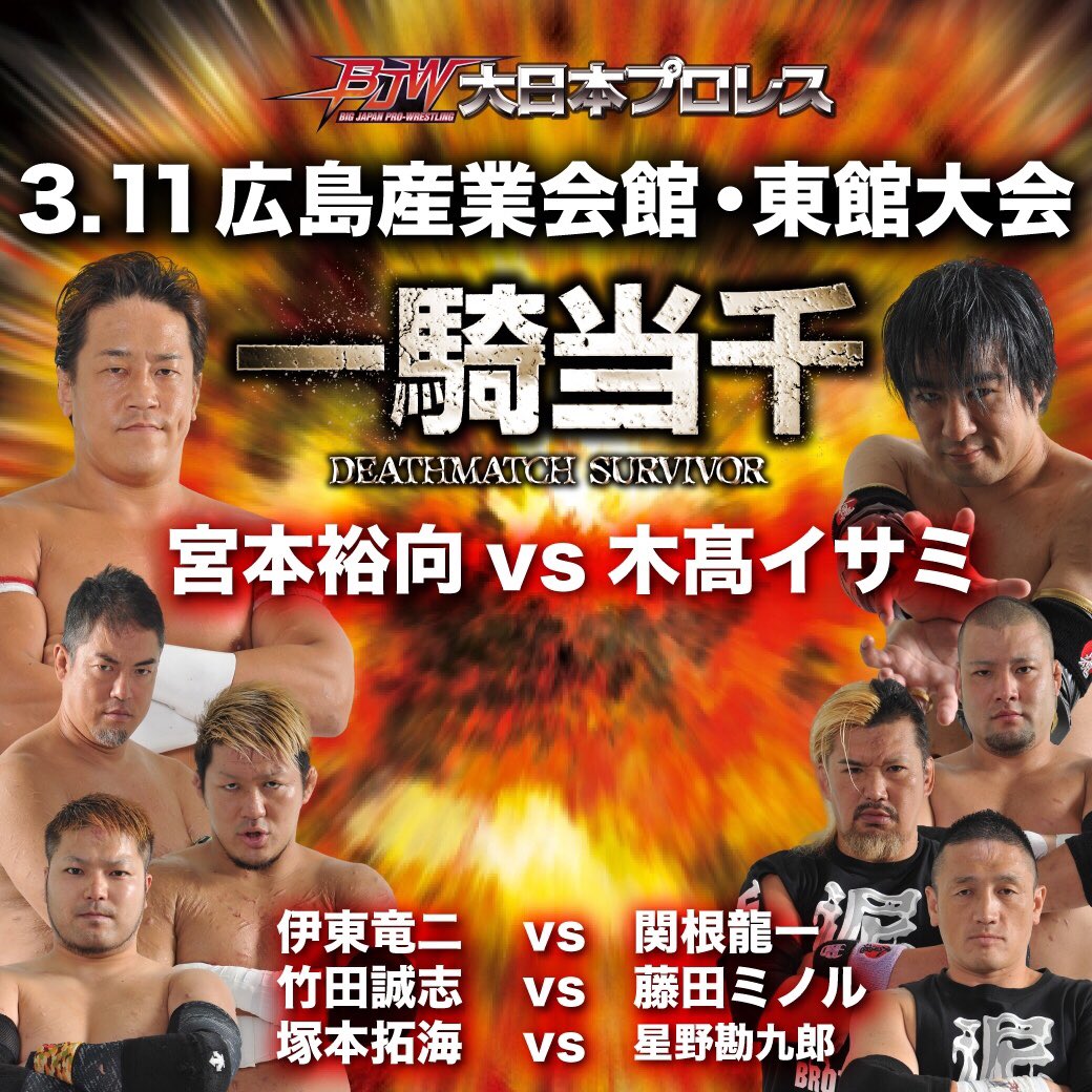 【大日本】二丁拳銃のシングル対決が広島で実現!宮本裕向vs木髙イサミ!3/11(月)「一騎当千~公式戦」広島県立産業会館・東館大会