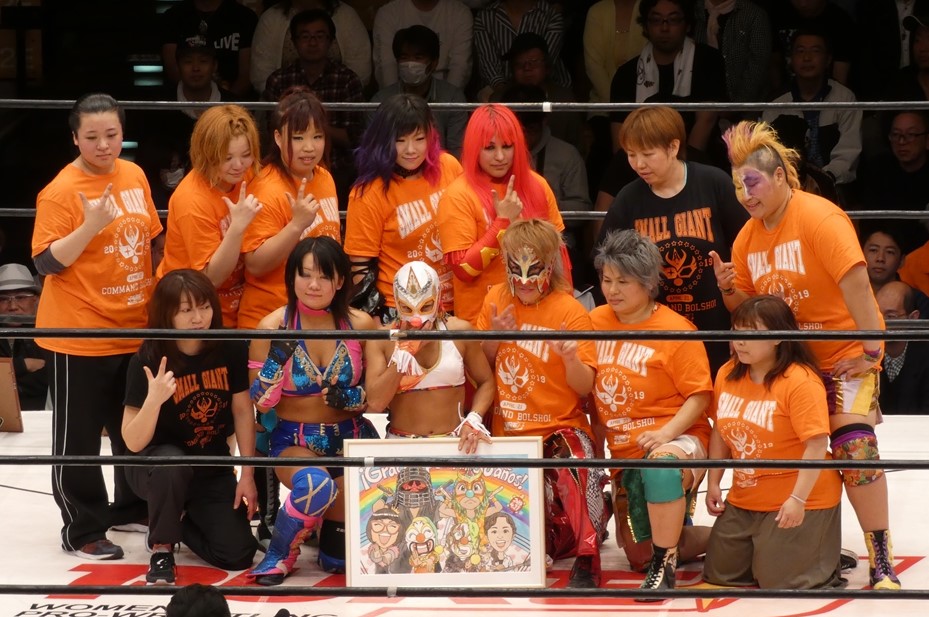 試合後のセレモニーにはJWPのOGやジャパン女子の同期生、現役レスラーなどがボリショイの引退に駆けつけた。