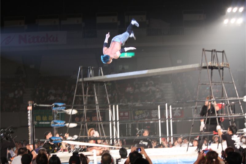 佐久田は入場時に持ち込んだ蛍光灯の束をイサミに載せてその上にファイヤーバードスプラッシュ